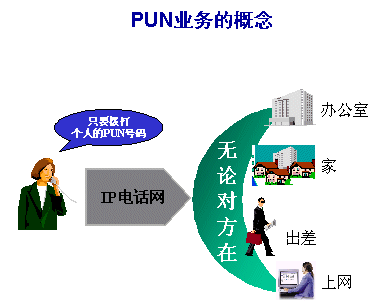 PUN業(yè)務(wù)首先給注冊(cè)用戶(hù)分配一個(gè)號(hào)碼,此號(hào)碼根據(jù)運(yùn)營(yíng)商所申請(qǐng)到的網(wǎng)號(hào)及用戶(hù)規(guī)模來(lái)規(guī)劃,如181XXXXXXX,申請(qǐng)到該號(hào)碼后,用戶(hù)可以通過(guò)各種方便的方式(如上網(wǎng)、打電話)等將此號(hào)碼綁定到任一特定終端,如家庭電話,移動(dòng)手機(jī)等,綁定以后,任何人在任何地點(diǎn)都可以通過(guò)拔打此號(hào)碼,PUN系統(tǒng)將會(huì)根據(jù)用戶(hù)的設(shè)置,將此呼叫經(jīng)IP網(wǎng)絡(luò)送至對(duì)應(yīng)的終端,從而完成呼叫,PUN用戶(hù)還可以設(shè)置繁雜的規(guī)劃,如當(dāng)手機(jī)關(guān)機(jī)時(shí),將呼叫送至某一固定電話,或在用戶(hù)上網(wǎng)時(shí),首選PC機(jī)作為呼叫終端,也可以根據(jù)時(shí)間段來(lái)靈活設(shè)置終端,其設(shè)置方法也比傳統(tǒng)的呼叫轉(zhuǎn)移更加方便和靈活。其圖一: