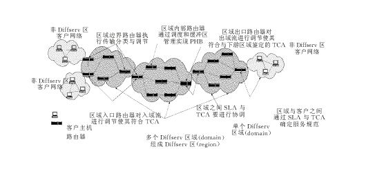 區(qū)分服務(wù)是由綜合服務(wù)(Int-serv )發(fā)展而來的,它采用了IETF的基于RSVP的服務(wù)分類標(biāo)準(zhǔn),拋棄了分組流沿路節(jié)點(diǎn)上的資源預(yù)留。區(qū)分服務(wù)將會有效地取代跨越大范圍的RSVP的使用。區(qū)分服務(wù)區(qū)域的主要成員有:核心路由器、邊緣路由器、資源控制器(BB,Bandwidth Broker)。在區(qū)分服務(wù)中,網(wǎng)絡(luò)的邊緣設(shè)備對每個(gè)分組進(jìn)行分類、標(biāo)記DS域,用DS域來攜帶IP分組對服務(wù)的需求信息。在網(wǎng)絡(luò)的核心節(jié)點(diǎn)上,路由器根據(jù)分組頭上的DS碼點(diǎn)(Code Point)選擇碼點(diǎn)所對應(yīng)的轉(zhuǎn)發(fā)處理。資源控制器BB配置了管理規(guī)則,為客戶分配資源,它可以通過服務(wù)級別協(xié)定SLA (Service Level Agreement)與客戶進(jìn)行相互協(xié)調(diào)以分享規(guī)定的帶寬。