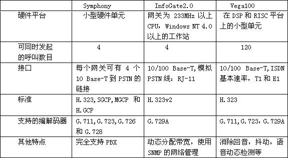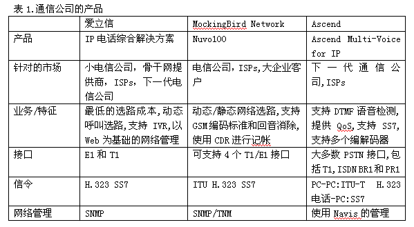 企業(yè)這部分市場與通信公司那部分不同。第一,企業(yè)不需要運載公眾呼叫,因此產(chǎn)品的規(guī)模較小。第二,企業(yè)愿意用連接到公司內(nèi)部網(wǎng)絡的IP電話產(chǎn)品代替?zhèn)鹘y(tǒng)的PBXs,因此這部分產(chǎn)品必須提供基本的PBX功能,比如呼叫保持和呼叫轉(zhuǎn)移。表2是一些相關的產(chǎn)品。