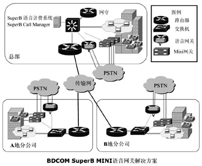 根據(jù)西北石油公司各地分公司電話全部是PSTN直線電話,沒有單位內(nèi)部的PBX,不能通過語音網(wǎng)關(guān)把這些直線電話統(tǒng)一接入到IP網(wǎng)絡(luò)上這一實際情況,方案提供方博達公司提供了一款小型BDCOM SuperB Mini語音網(wǎng)關(guān),來解決PSTN程控電話統(tǒng)一接入IP語音網(wǎng)絡(luò)的問題。使用BDCOM SuperB Mini并結(jié)合西北石油公司組建的企業(yè)內(nèi)部VoIP網(wǎng)絡(luò),克服了傳統(tǒng)語音網(wǎng)關(guān)解決方案的不足和缺點。