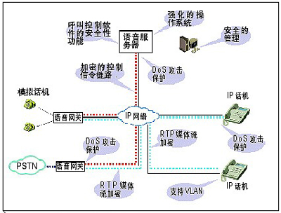 IP電話的各個組成部分從語音服務(wù)器、語音網(wǎng)關(guān)到IP電話都能夠?qū)oS攻擊具有相應(yīng)的保護(hù)功能: