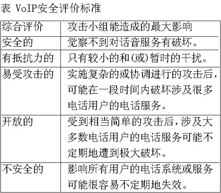 測試結果表明,采用了復雜攻擊手段的攻擊小組無法破壞思科公司的VoIP網絡,甚至無法對其造成顯著的干擾。這套精心制造的IP電話系統(tǒng)(包括第二層和第三層基礎設施以及各式各樣的附加安全軟件)是“安全的”(參見表中所示的VoIP安全評價標準),它最大限度地全面發(fā)揮了思科公司的網絡安全專長,利用了思科公司擁有的每一種防御武器。