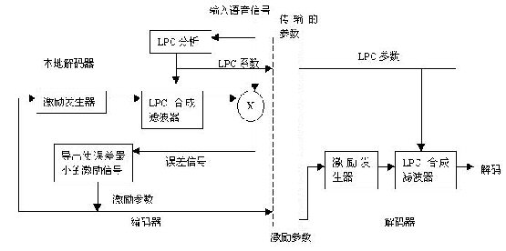 為了說明問題,考慮人的聲道產(chǎn)生的一個語音模式:當人說話產(chǎn)生語音信號時就會發(fā)出濁音(如音素pa、da等)和清音(如音素sh、th)。激勵信號就是由輸入的語音信號導出的,其方法是使合成語音與輸入語音的差別非常小。LPC的用法、激勵的產(chǎn)生以及對合成分析(AbS)系統(tǒng)的誤差檢查均如圖4-1所示。