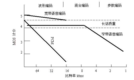 長話質(zhì)量編碼器在比特率高于8Kbps時容易實現(xiàn),如圖4-2所示。長話質(zhì)量的語音平均意見得分(MOS)必須在分或許分以上。傳統(tǒng)的PCN語音在比特率小于32