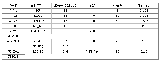 標準 編碼類型 比特率 MOS 復雜性 時延 (kbps) (ms) G.711 PCM 64 4.3 1 0.125 G.726 ADPCM