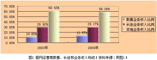 目前數(shù)據(jù)業(yè)務(wù)收入與話(huà)音業(yè)務(wù)收入相差懸殊,通過(guò)發(fā)展數(shù)據(jù)業(yè)務(wù)彌補(bǔ)VoIP造成的話(huà)音收入損失尚需時(shí)日。以固網(wǎng)運(yùn)營(yíng)商為例,2003年和2004年數(shù)據(jù)業(yè)務(wù)、長(zhǎng)途業(yè)務(wù)和本地業(yè)務(wù)收入構(gòu)成見(jiàn)圖2所示。