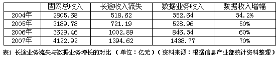 表1 長(zhǎng)途業(yè)務(wù)流失與數(shù)據(jù)業(yè)務(wù)增長(zhǎng)的對(duì)比 (單位:億元)(資料來(lái)源:根據(jù)信息產(chǎn)業(yè)部統(tǒng)計(jì)資料整理)