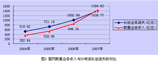 從圖2可知,固網(wǎng)運(yùn)營(yíng)商數(shù)據(jù)業(yè)務(wù)收入2003年和2004年僅占總收入的10.65%和12.5%,數(shù)據(jù)業(yè)務(wù)年增幅達(dá)34.2%,數(shù)據(jù)業(yè)務(wù)收入增加值為89.87億元;同期,因IP電話(huà)分流造成的長(zhǎng)途業(yè)務(wù)減收為146.06億元,可見(jiàn)在2004年數(shù)據(jù)業(yè)務(wù)的增長(zhǎng)彌補(bǔ)不了IP電話(huà)分流造成的長(zhǎng)途業(yè)務(wù)收入的流失。