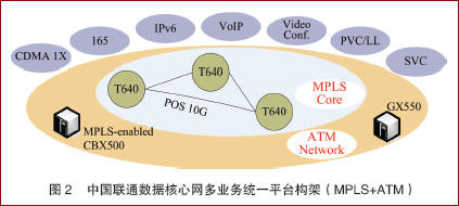 中國聯(lián)通IP電話網(wǎng)的承載網(wǎng)分為核心層和區(qū)域?qū)觾杉壗Y(jié)構(gòu),核心層由北京、上海、廣州、沈陽、武漢、西安和成都7個(gè)大區(qū)節(jié)點(diǎn)組成;區(qū)域?qū)影锤鞣止緟^(qū)域分布情況,劃分為22個(gè)區(qū)域。建網(wǎng)初期,承載網(wǎng)采用ATM+IP/VPN組成IP電話專用傳輸網(wǎng),確保IP承載層的QoS,網(wǎng)絡(luò)性能符合聯(lián)通測試指標(biāo)。下一階段,中國聯(lián)通數(shù)據(jù)核心網(wǎng)的技術(shù)演進(jìn)路線方向如圖2所示。網(wǎng)絡(luò)將以MPLS+ATM為核心技術(shù),在7大核心節(jié)點(diǎn)建設(shè)功能強(qiáng)大的MPLS核心網(wǎng)絡(luò),同時(shí)采用2層MPLS技術(shù),實(shí)現(xiàn)與ATM設(shè)備的透明連接,從而構(gòu)建一個(gè)多協(xié)議、多業(yè)務(wù)同時(shí)兼顧IPv4/IPv6發(fā)展的先進(jìn)網(wǎng)絡(luò)。中國聯(lián)通的互聯(lián)網(wǎng)、數(shù)據(jù)專線、IP電話、視頻會議、IPv6網(wǎng)絡(luò)、CDMA1X數(shù)據(jù)通信網(wǎng)等都承載在統(tǒng)一的數(shù)據(jù)傳送平臺之上。