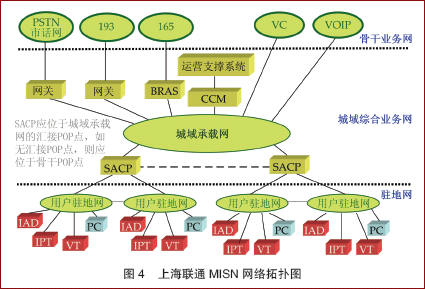 上海聯(lián)通MISN由5個(gè)部分組成(見圖4):(1)業(yè)務(wù)接入控制設(shè)備(SACP)。從用戶駐地網(wǎng)到城域網(wǎng)和骨務(wù)都必須通過SACP接的接入認(rèn)證、業(yè)務(wù)接入控制、網(wǎng)絡(luò)資源管理和服務(wù)質(zhì)量控制等。(2)呼叫管理控制模塊(CCM)。該模塊負(fù)責(zé)對用戶注冊的管理;通過SACP對業(yè)務(wù)接入進(jìn)行認(rèn)證和控制;與骨干業(yè)務(wù)網(wǎng)GK互通,完成各種業(yè)務(wù)的呼叫控制;與SACP一起采集計(jì)費(fèi)信息;負(fù)責(zé)控制語音和視頻媒體流的接入。(3)業(yè)務(wù)網(wǎng)關(guān)。聯(lián)通MISN是基于IP的分組網(wǎng),與基于電路交換的193長途電話骨干網(wǎng)和本地PSTN市話網(wǎng)互通時(shí),由于媒體層面和控制信令層面都不同,因此,需要通過網(wǎng)關(guān)進(jìn)行互通。(4)BRAS設(shè)備。負(fù)責(zé)將互聯(lián)網(wǎng)接入到165網(wǎng)。(5)業(yè)務(wù)運(yùn)營支撐系統(tǒng)。該系統(tǒng)包括維護(hù)網(wǎng)管系統(tǒng)、用戶終端管理系統(tǒng)、用戶管理(業(yè)務(wù)受理、用戶信息管理、用戶業(yè)務(wù)授權(quán)與認(rèn)證)以及本地MISN的計(jì)費(fèi)/營賬系統(tǒng),其對上的接口是各骨干業(yè)務(wù)網(wǎng)的運(yùn)維支撐系統(tǒng)。