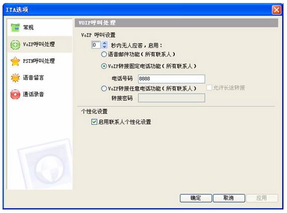 啟動 VoIP呼叫轉(zhuǎn)接固定電話功能,設(shè)置0秒啟動,轉(zhuǎn)接固定電話號碼為交換機內(nèi)置語音引導(dǎo)號。如圖,8888是深圳交換機上配置的語音引導(dǎo)號,直接撥打8888會聽到“歡迎致電某某公司,請直撥分機號碼,查號請撥