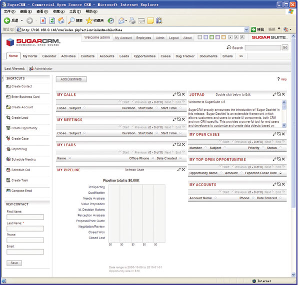 SugarCRM的默認界面提供了個人門戶、日歷、事件、聯(lián)系人、機會管理、項目、問題追蹤、文檔等常用模塊,用戶還可以根據(jù)自己的需要增加新的模塊。當(dāng)前,SugarCRM已經(jīng)能夠較好地支持簡體中文,即使在英文界面中,也可以顯示和編輯中文字符,但在基于中文的排序方面尚未實現(xiàn)。另外,雖然SugarCRM提供了簡體中文語言包,但是只支持UTF-8編碼,在我們實測中發(fā)現(xiàn)會有亂碼問題,因此建議用戶還是選擇在英文界面中處理簡體中文。