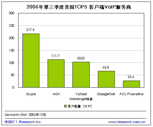 iResearch艾瑞市場咨詢根據(jù)In-Stat的統(tǒng)計數(shù)字整理發(fā)現(xiàn),目前在美國VoIP市場中,以客戶端為服務(wù)基礎(chǔ)的服務(wù)提供商的用戶數(shù)量來看,占市場主導(dǎo)位置的五大服務(wù)商為Skype、MSN、Yahoo、Google和AOL.到2006年第三季度為止,Skype的用戶已經(jīng)達(dá)到了217.4萬,排名第五位AOL Phoneline的用戶數(shù)量也有26.6萬之多。
