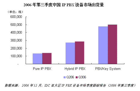根據(jù)《IDC亞太區(qū)IP PBX市場季度跟蹤報告(2006年第三季度)》中國部分數(shù)據(jù)顯示,2006年第三季度中國PBX系統(tǒng)出貨量接近100萬線,其中純IP PBX占到15.1%,混合PBX占到30.9%,傳統(tǒng)PBX占到54%。