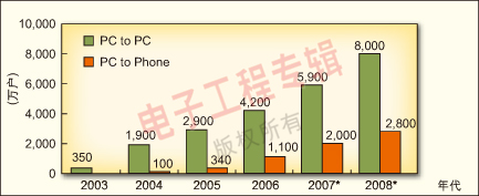 圖6:2003-2006年中國(guó)大陸VoIP用戶增長(zhǎng)及2007-2008年預(yù)測(cè)。