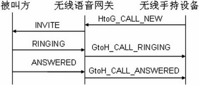 當(dāng)用戶通過無線手持設(shè)備撥打一個(gè)號(hào)碼時(shí),無線手持設(shè)備將發(fā)送一個(gè)HtoG_CALL_ NEW的內(nèi)部會(huì)話信令連同呼叫的號(hào)碼給無線語音網(wǎng)關(guān),無線語音網(wǎng)關(guān)收到該信令后,將根據(jù)該信令構(gòu)造相應(yīng)的SIP消息并發(fā)送到外部網(wǎng)絡(luò)。當(dāng)無線語音網(wǎng)關(guān)收到來自被叫方表示振鈴信息的暫時(shí)應(yīng)答RINGING時(shí),將發(fā)送一個(gè)GtoH_CALL_RINGING的內(nèi)部會(huì)話信令給手持設(shè)備。當(dāng)無線語音網(wǎng)關(guān)收到來自被叫方表示應(yīng)答的信息ANSWERED時(shí),語音網(wǎng)關(guān)將啟動(dòng)RTP線程并發(fā)送一個(gè)GtoH_CALL_ANSWERED的內(nèi)部會(huì)話信令給手持設(shè)備以通知被叫方已應(yīng)答。此時(shí)手持設(shè)備開啟語音進(jìn)程,與被叫方實(shí)現(xiàn)通話。