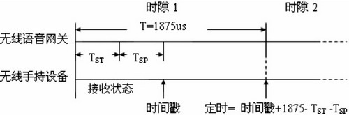 時(shí)隙1開始后,語音網(wǎng)關(guān)需要TSTms的時(shí)間將射頻芯片從空閑狀態(tài)轉(zhuǎn)換為發(fā)送狀態(tài),當(dāng)轉(zhuǎn)換為發(fā)送狀態(tài)后,預(yù)先存儲(chǔ)在射頻芯片發(fā)送RAM中的信標(biāo)幀立即開始發(fā)送,手持設(shè)備上的射頻芯片在收到六個(gè)字節(jié)TSPms后自動(dòng)鎖存一個(gè)當(dāng)前時(shí)間timestamp(時(shí)間戳),