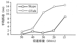 kbit/s時,GTalk發(fā)生了很明顯的變化,傳輸速率降低到了35 kbit/s。這個變化使得其PESQ MOS分數(shù)與Skype相比有所提高,而Skype的傳輸速率則接近信道容量。當信道容量變?yōu)?0