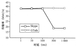 ms時通話是可以接受的,時延為500 ms、1 000 ms時語音質量就變得不可接受。對于Skype,時延對其服務質量的影響更為明顯,如圖5所示,傳輸率從37.5