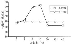 MOS分數(shù)的下降。另一方面,Skype在有較高時,傳輸率有明顯的下降,導致業(yè)務質量更糟。