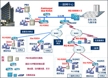3、銳捷26系列VOIP路由器支持Gatekeeper功能,通過簡單的配置連接到關(guān)守(Gatekeeper)上就可以與全省各地進(jìn)行VOIP連接,而省略了煩瑣的靜態(tài)撥號(hào)對(duì)等體的配置,方便而高效。