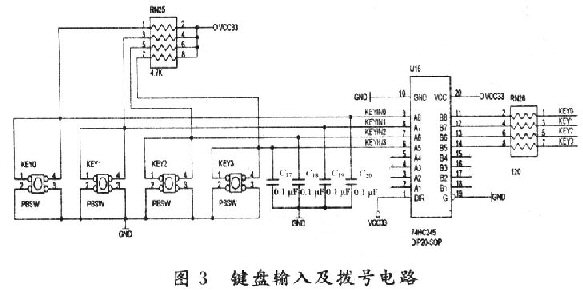 為實現(xiàn)IP電話與普通電話的通用性,該終端加入鍵盤模塊,按鍵開關(guān)KEY0~KEY9,KEY_X,KEY_Y,KEY_ON,KEY_OFF(其中,除KEY_ON和KEY_OFF是鎖閉式按鍵外,其余均為非鎖閉式按鍵)采用行列掃描式接法,加入了74HC245總線收發(fā)器作為緩沖器,電路如圖3所示(由于按鍵過多,圖中僅給出KEY0~KEY3電路)。