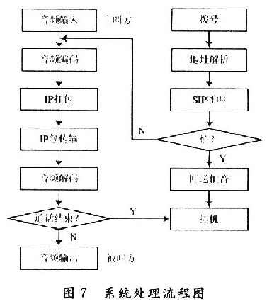 當(dāng)撥號確認后,主控制器對編解碼器發(fā)送控制指令,開始語音A/D轉(zhuǎn)換,并進行編碼,送到片外存儲器內(nèi)進行緩存;Nios CPU對撥號信息的解析確定。目的地址,通過Avalon總線對以太網(wǎng)接口發(fā)送數(shù)據(jù)傳輸指令;將符合以太網(wǎng)標(biāo)準(zhǔn)的數(shù)據(jù)從片外存儲器內(nèi)讀出,送入Internet中,返回確認信息。系統(tǒng)處理流程圖如圖7所示。