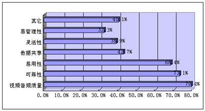 對于視頻會議系統(tǒng)需求特征,我們調查發(fā)現(xiàn),視頻音頻質量、可靠性、易用性排在前三位,數(shù)據(jù)共享、靈活性、易管理性也得到應有的關注和重視,如圖4所示。