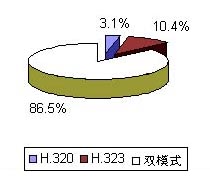 如圖5所示,目前僅僅存在少量單一H.320產品,雙模式產品在市場中占據(jù)著主導地位,單一的H.323模式主要由桌面會議系統(tǒng)占據(jù),市場份額穩(wěn)步增長。