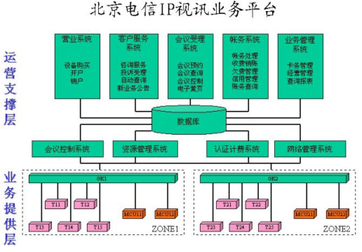 在整個運(yùn)營支撐層的系統(tǒng)中,主要包括四大系統(tǒng),即會議控制系統(tǒng)、資源管理系統(tǒng)、認(rèn)證計費系統(tǒng)、網(wǎng)絡(luò)管理系統(tǒng)。除此之外,還有其它幾個輔助系統(tǒng),包括營業(yè)系統(tǒng)負(fù)責(zé)為客戶開戶和銷戶,終端注冊等處理;客戶服務(wù)系統(tǒng)提供咨詢服務(wù)、投訴受理、自動查詢和幫助客戶進(jìn)行會議預(yù)約,在資源不足的情況下進(jìn)行會議調(diào)度等;會議受理系統(tǒng)是面向客戶提供會議電視業(yè)務(wù)預(yù)約、會議狀態(tài)查詢、會議控制服務(wù),由用戶自助完成預(yù)約會議和控制會議的操作;賬務(wù)系統(tǒng)負(fù)責(zé)賬務(wù)方面的管理,包括賬務(wù)管理,收費銷賬,催繳欠費、銀行繳費等;業(yè)務(wù)管理系統(tǒng)主要是記賬卡的卡務(wù)處理、經(jīng)營管理、查詢報表等。