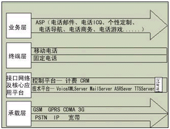 企業(yè)利用語(yǔ)音門戶,可以通過(guò)節(jié)省人工座席成本實(shí)現(xiàn)低成本地發(fā)布信息,提供客戶服務(wù),而且可以實(shí)現(xiàn)其它有價(jià)值的業(yè)務(wù),開創(chuàng)新的市場(chǎng)空間和利潤(rùn),其業(yè)務(wù)系統(tǒng)層次如圖2所示。