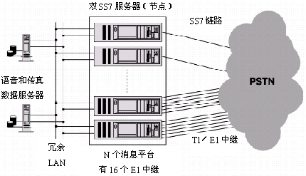 那兩個(gè)SS7節(jié)點(diǎn)是以冗余方式配置的,共享相同的信令點(diǎn)編碼,為所有的媒體節(jié)點(diǎn)提供呼叫控制。圖中所示的所有SS7鏈路采用單信令點(diǎn)編碼冗余方式備份,即使其中一個(gè) SS7節(jié)點(diǎn)出現(xiàn)故障,信令系統(tǒng)仍能繼續(xù)為呼入提供不中斷的語(yǔ)音信箱訪問(wèn)。