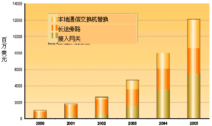 隨著因特網(wǎng)業(yè)務(wù)的普及,與傳統(tǒng)電信業(yè)務(wù)供應(yīng)商形成競爭、替代局面的新業(yè)務(wù)供應(yīng)商看到了重大的機(jī)會(huì):利用通過包網(wǎng)絡(luò)傳送話音(VoP)業(yè)務(wù)取代分離的話音/數(shù)據(jù)網(wǎng)業(yè)務(wù)。VoP技術(shù)最初主要用于長途旁路。在過去的兩年里,VoP網(wǎng)絡(luò)的發(fā)展勢(shì)頭明顯加快,通過寬帶網(wǎng)傳送話音的接入網(wǎng)關(guān)正在推廣,利用VoP本地網(wǎng)關(guān)代替?zhèn)鹘y(tǒng)中心局交換機(jī)的機(jī)會(huì)也已出現(xiàn)。圖1用圖例說明了VoP在交換機(jī)替換、長途旁路和接入網(wǎng)關(guān)方面市場的分塊大小以及對(duì)末來的預(yù)測(cè)。