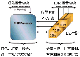 這種新型半導(dǎo)體元件被叫作語音處理器(VP),它不是技術(shù)創(chuàng)新成果,而只是傳統(tǒng)DSP核心和通用RISC處理器在一個(gè)或兩個(gè)硅片上的重新包裝和集成。DSP核心完成VoP的壓縮、回聲抑制和各種信號(hào)處理任務(wù),而RISC處理器完成VoP的匯聚和打包處理。