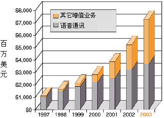 為了獲得競(jìng)爭(zhēng)優(yōu)勢(shì),業(yè)務(wù)提供商──傳統(tǒng)長(zhǎng)途運(yùn)營(yíng)和本地交換運(yùn)營(yíng)商,因特網(wǎng)業(yè)務(wù)提供商(ISP),應(yīng)用業(yè)務(wù)提供商,以及無(wú)線運(yùn)營(yíng)商──都在想方設(shè)法發(fā)布基于IP的業(yè)務(wù),這些業(yè)務(wù)應(yīng)該:對(duì)用戶有較高的價(jià)值,能縮短面市所需時(shí)間,部署是低成本高效益的。向用戶提供高價(jià)值的增值業(yè)務(wù)能為業(yè)務(wù)提供商帶來(lái)重要的收入源泉,并使他們更有特色,增加市場(chǎng)分額,特別是如果這些業(yè)務(wù)以快速、易于支持的方式部署,以上這些優(yōu)勢(shì)就會(huì)更加突出。據(jù)估計(jì),到2003年增值業(yè)務(wù)設(shè)備僅在美國(guó)就能達(dá)到73億美元的市場(chǎng),正如圖1所示。