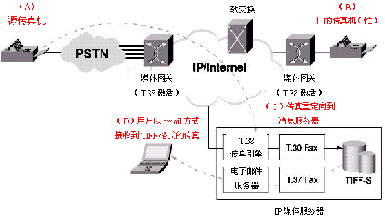 T.38規(guī)定了實(shí)時(shí)IP傳真的標(biāo)準(zhǔn)。因此,源于PSTN的一個(gè)傳真會(huì)話能夠以T.38的格式進(jìn)入IP網(wǎng)絡(luò)。在IP媒體服務(wù)器中通過(guò)使用T.30,T.38和T.37,實(shí)時(shí)傳真會(huì)話可以把IP媒體服務(wù)器作為終端,并把實(shí)時(shí)傳真轉(zhuǎn)換成T.37兼容的傳真消息。然后,這個(gè)傳真消息會(huì)被用來(lái)產(chǎn)生一個(gè)就象一個(gè)電子郵件會(huì)話的T.37傳真。這使得IP媒體服務(wù)器可以提供"永不示忙"的IP傳真功能。這個(gè)功能也將為統(tǒng)一消息應(yīng)用提供基于IP的傳真郵箱能力。