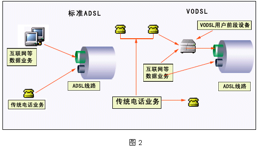 VoDSL技術(shù),就是利用xDSL技術(shù)在一對傳統(tǒng)電話用戶線上,維持原有電話業(yè)務(wù)的同時,提供高速數(shù)據(jù)業(yè)務(wù)(如互聯(lián)網(wǎng)業(yè)務(wù))和多個額外電話業(yè)務(wù)。利用VoDSL技術(shù),業(yè)務(wù)提供商在無需增添新的數(shù)據(jù)網(wǎng)絡(luò)或硬件線路就可以為用戶提供高速的數(shù)據(jù)接入和更多的電話線路數(shù)及其他增值業(yè)務(wù),從而減少運營成本,擴大了利潤空間。下圖2的左邊給出了電話運營商采用ADSL技術(shù)的基本配置,右邊則給出了VoDSL應(yīng)用。