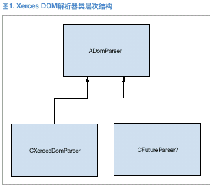 Xerces DOM解析器對象的類層次結(jié)構(gòu)非常類似于其它CSF電話網(wǎng)絡(luò)、數(shù)據(jù)通信或語音設(shè)備。抽象的DOM解析器設(shè)備包括實施任何類似解析器的有用狀態(tài)信息和基本數(shù)據(jù)及方法。具體的XercesDOMParser類出自于抽象類,并提供了針對特定Xerces解析器的具體方法和數(shù)據(jù)。其它類似的DOM解析器如果添加到CSF,也可以基于同樣的抽象類進(jìn)行構(gòu)建。圖1詳細(xì)描述了該類層次結(jié)構(gòu)。