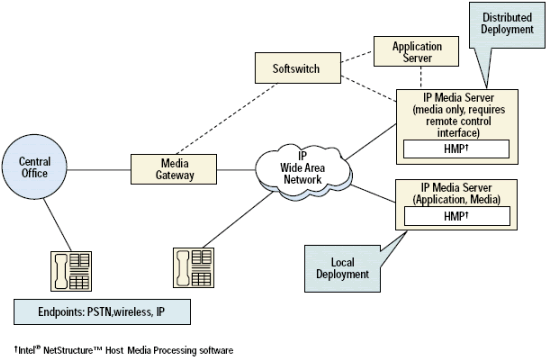 一個(gè)IP媒體服務(wù)器是在網(wǎng)絡(luò)中的終結(jié)IP連接的節(jié)點(diǎn). 根據(jù)客戶環(huán)境的不同(服務(wù)提供商或企業(yè)), IP媒體服務(wù)器可以用很多方法來(lái)實(shí)現(xiàn).