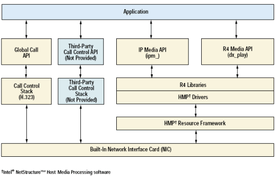 應(yīng)用程序在HMP軟件上開(kāi)發(fā)時(shí)使用相同的R4和GlobalCall API, 和Dialogic Dialogic板卡
