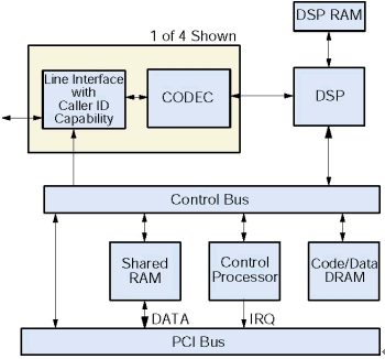 一個板卡上的微處理器控制D/4PCIU和D/4PCIUF通過一個本地總線控制板卡所有操作,它從主機(jī)截獲和執(zhí)行命令。這個微處理器處理實(shí)時的事件,管理和主機(jī)交互的數(shù)據(jù)流,提高系統(tǒng)的反應(yīng)時間,減少主機(jī)處理的需求,傳遞給應(yīng)用程序之前處理DTMF和電話信令,把DSP解脫出來專門做信令處理。這個微處理器和主機(jī)的通信是通過一個共享RAM,它作為一個輸入/輸出緩沖區(qū)增加的磁盤文件傳輸?shù)男省_@個RAM和主機(jī)的接口是PCI總線。為了滿足實(shí)時系統(tǒng)的要求,所有操作的是中斷驅(qū)動的。所有安裝在PC里面的D/4PCIUF板卡共享同一個中斷。在系統(tǒng)初始化的時候,固件從主機(jī)下載到板卡上的代碼/數(shù)據(jù)