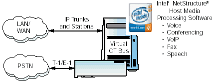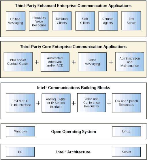 - 第3層:PSTN或IP中繼線接口的Dialogic通信構(gòu)建模塊;模擬、數(shù)字或IP站接口;以及語音、會議、傳真和話音(speech)資源。