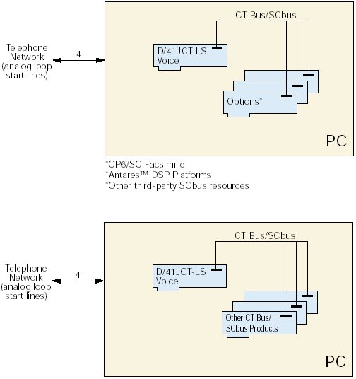 使用D/41JCT-LS板卡和CT總線時,來自網(wǎng)絡(luò)板卡或其他資源的數(shù)字語音和資源通過H.100接頭和CT總線接口進(jìn)入板卡。由一個CT612芯片管理這些信號,并且作為通道協(xié)調(diào)器和矩陣交換機來緩存來自總線的高速信號數(shù)據(jù),直到每個通道的數(shù)據(jù)發(fā)送到DSP。