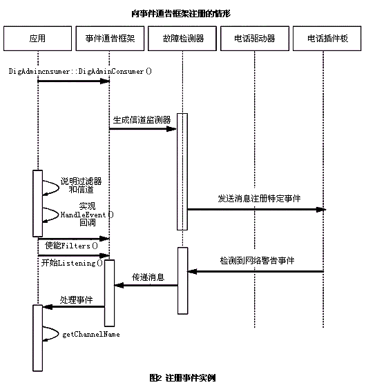 。。系統(tǒng)版包括事件服務(wù)API和事件通告框架。這些API用來向事件通告框架注冊你的應(yīng)用。框架是使所有操作、管理、維護和定制服務(wù)(OAM&P)向已注冊的電話應(yīng)用發(fā)送異步消息的子系統(tǒng)。關(guān)于事件服務(wù)API和事件通告框架的詳細(xì)信息,可以參考系統(tǒng)版文檔中的編程指南。框架含有不同信道,這些信道用來報告與操作人員的一些被動或者主動的動作相關(guān)的事件。
