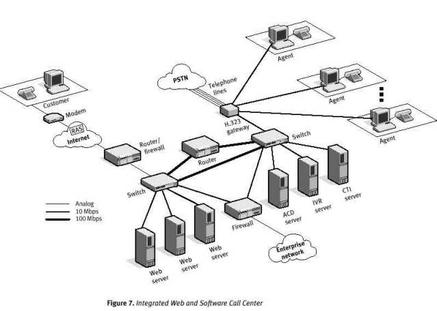 向基于軟件的呼叫中心模型遷移的第一步:通過使呼叫中心具有Web能力,將來自因特網(wǎng)的呼叫接入到現(xiàn)有呼叫中心中。圖5展示了H.323網(wǎng)關(guān)如何轉(zhuǎn)換VoIP呼叫到現(xiàn)有自動呼叫分配器(ACD)支持的傳統(tǒng)電話呼叫。這一簡單步驟,使公司能夠通過基于因特網(wǎng)的電話連接客戶。然而,在客戶所見到的Web頁面和業(yè)務(wù)代表的Web內(nèi)容及CTI數(shù)據(jù)之間,通常既沒有邏輯連接,也沒有物理連接。(CTI數(shù)據(jù)的獲得可能會通過在客戶的瀏覽器上下載一個(gè)代理或一個(gè)JAVA小程序?qū)崿F(xiàn),通過它發(fā)出客戶的位置等相關(guān)數(shù)據(jù))。因此在大多數(shù)情況下,客戶和業(yè)務(wù)代表在購買或支持過程中通過交談而解決問題。